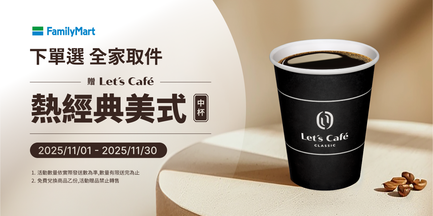 ◼︎活動實施辦法:活動期間內 ( 2025 年 11 月 1 日起 至 2025 年 11 月 23 日止 ) 完成下訂並於 2025 年 11 月 30 日 23:59 前 在 全家 完成取件者,即享有獲取資格 ( 活動品項 中杯 熱經典美式 乙組 ),贈送對象將於 2025 年 11 月 2 日起 至 2025 年 11 月 30 日止 依實際完成取件訂單,11/20依順序發放EMAIL通知,因數量有限送完為止,如未獲贈不另通知。