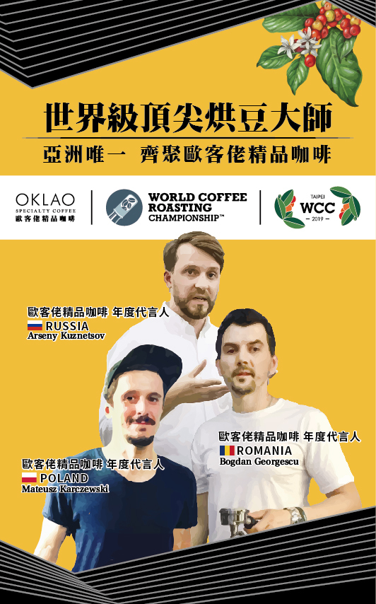 「2019 WCRC世界盃烘豆大賽」為全球咖啡賽事最高殿堂,堪稱精品咖啡界的奧運,2019年首度在台舉辦,來自23國世界頂尖好手齊聚,歐客佬是世界盃烘豆大賽的生豆贊助商,除了大賽本身對贊助商的原物料品質有高標準的要求之外,這三位選手也對我們的咖啡豆也表示肯定,歐客佬是亞洲唯一同時和冠軍、亞軍、季軍世界級頂尖烘豆大師合作的連鎖咖啡品牌。